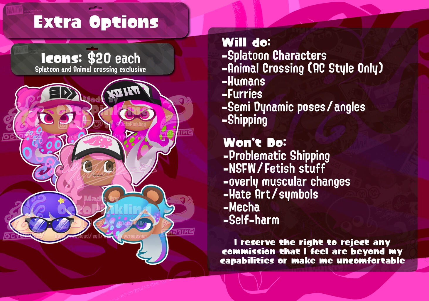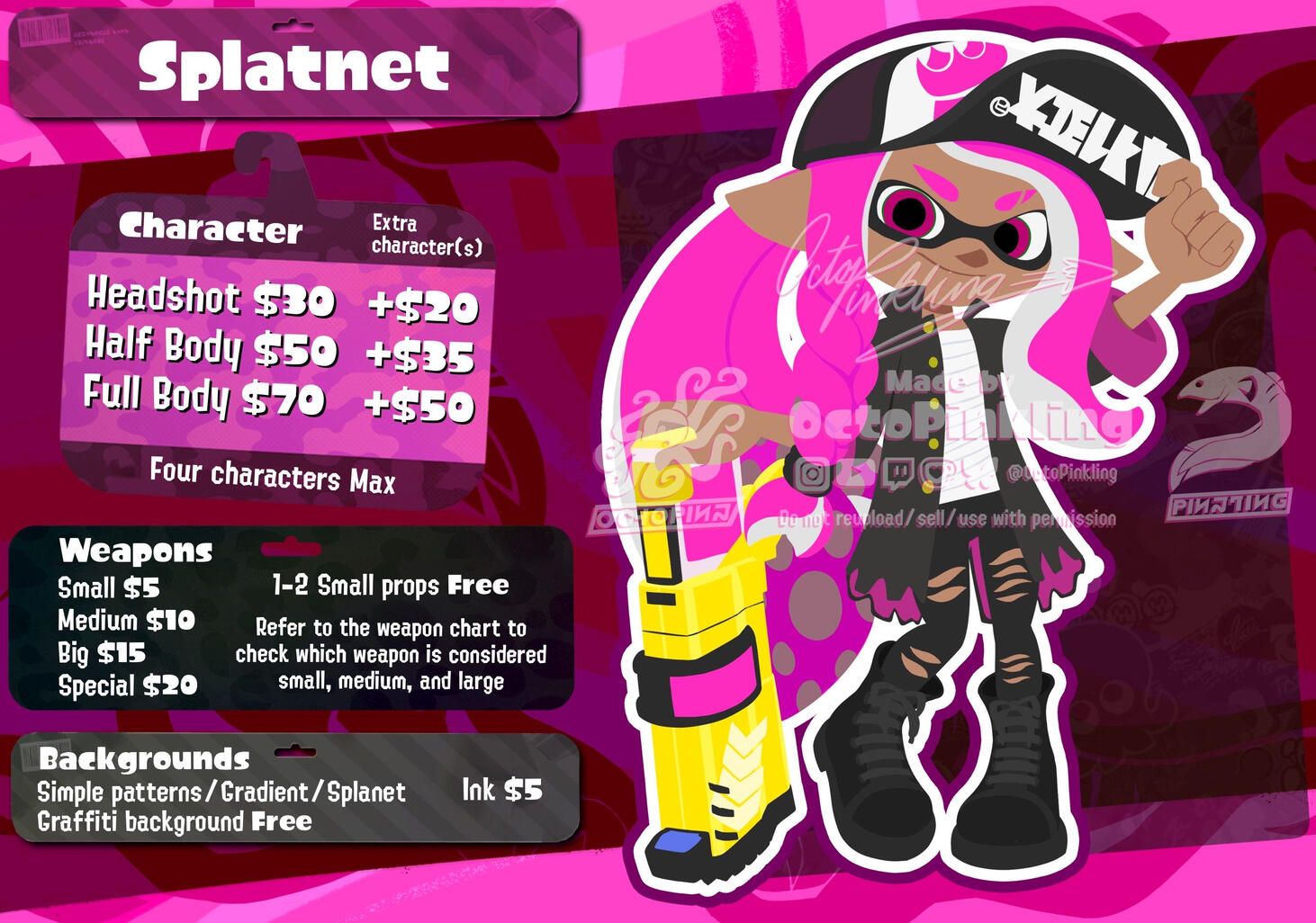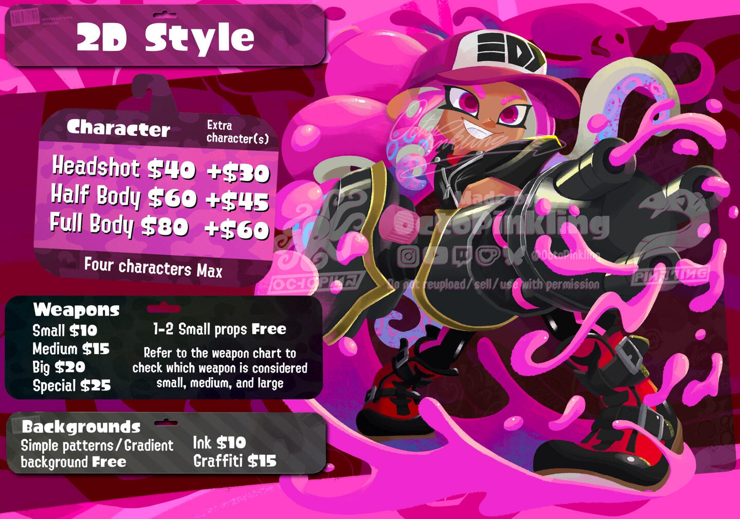 Hello! I'm OctoPinkling, sometimes referred to as Octopink or Pinkling. I am a Splatoon commission artist. I accept payment via PayPal or Ko-fi using either the Google form or Ko-fi's form!